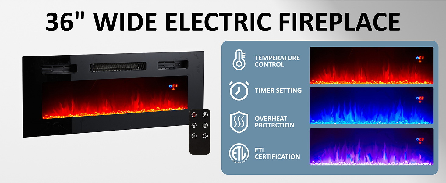 - 36" wide modern electric fireplace features 3 color realistic flame&5 level brightness.temperature control and time setting.750W/1500W Power heats quicker & energy efficient for max 4800 BTU output.Remote control included