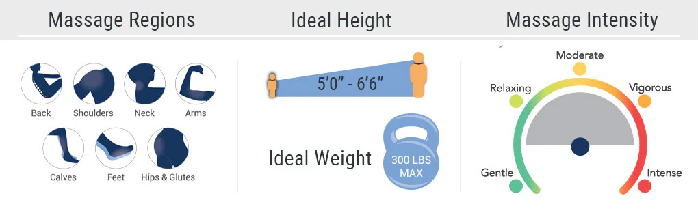 Zero gravity positioning elevates your knees above your heart. which allows the spine to decompress. provides a sense of weightlessness. and maximizes the effects of the massage rollers.