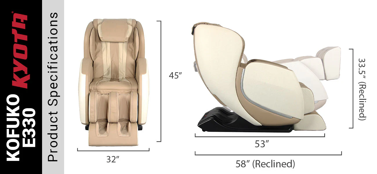 The Kyota E330 zero gravity massage chair has all the features of much more expensive chairs. Traveling L-track 4-node massage mechanism to travel from neck and shoulders to the gluteus muscles. Airbag massage in the shoulders. arms. palms. calves and feet. Foot roller reflexology. Full back scanning to automatically make micro-adjustments for your body specifics. Choose from 9 auto programs or take control and individually control each aspect of the massage to your liking. Includes Kyota 4 year limited warranty and delivery.