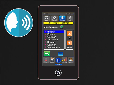 7 HUMAN-VOICE RESPONSE System (English. Vietnamese. Spanish. German. French. Japanese. and Korean). This chair gives instructions and confirms the commands you give it!
